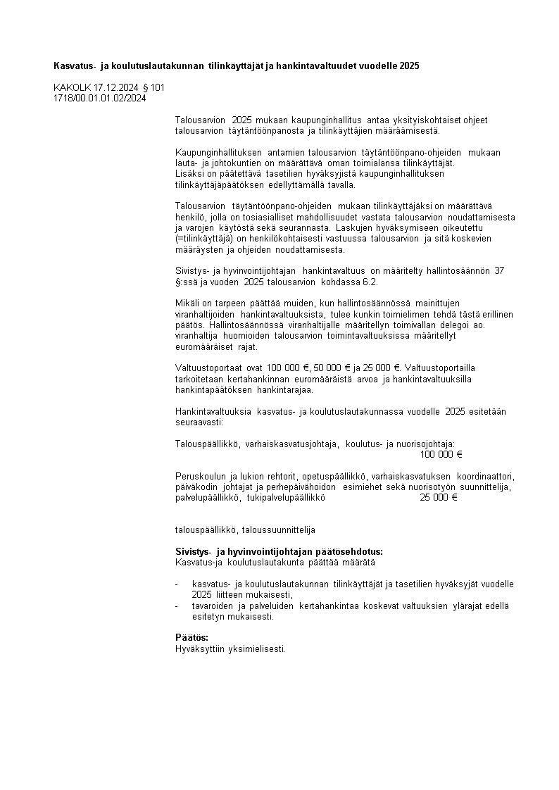 Pöytäkirja 17.12.2024/Pykälä 101