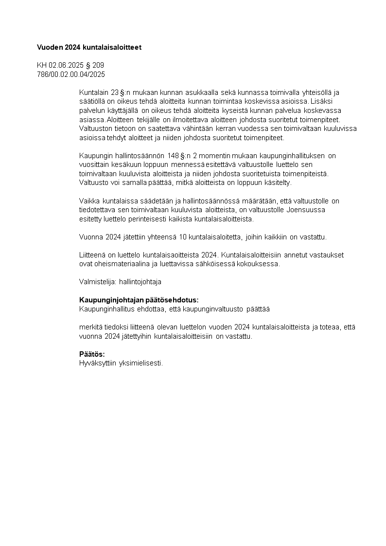 Pöytäkirja 02.06.2025/Pykälä 209