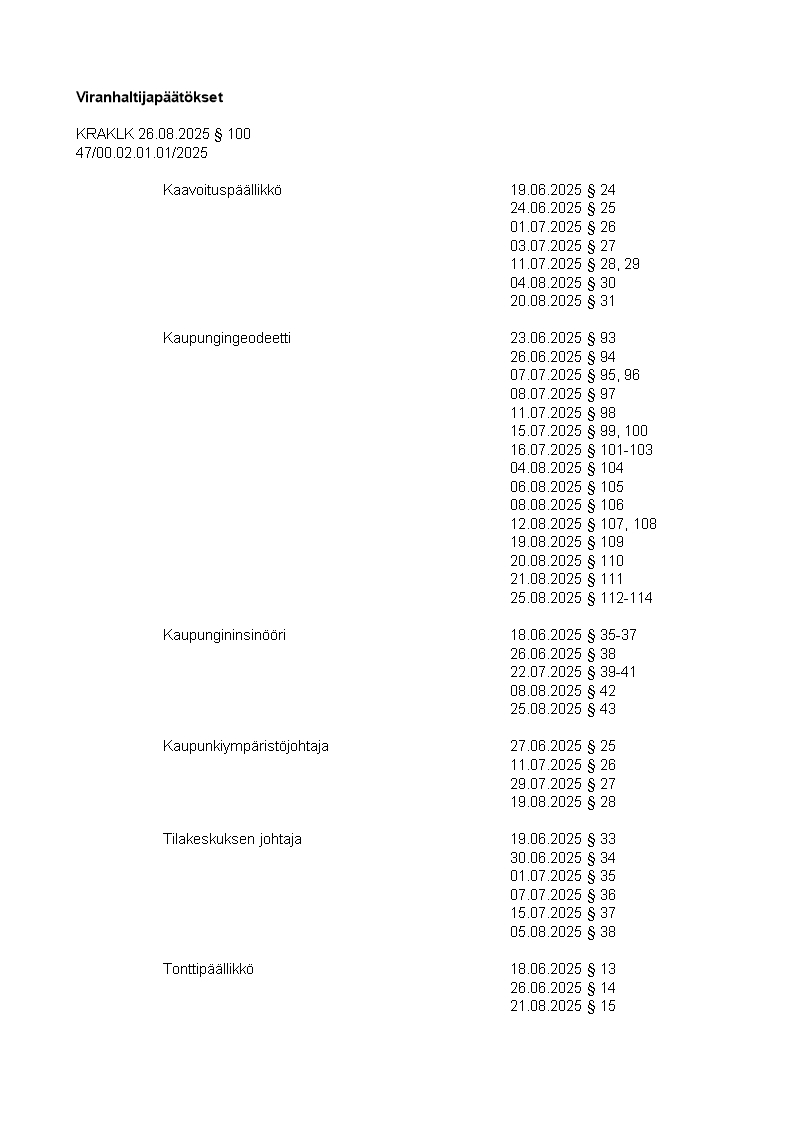 Pöytäkirja 26.08.2025/Pykälä 100