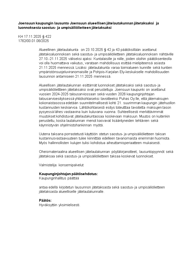Pöytäkirja 17.11.2025/Pykälä 422