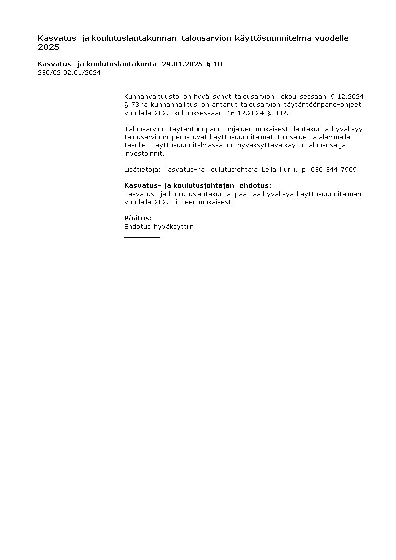 Liite 2 Käyttösuunnitelma kasvatus- ja koulutuslautakunta TA2025