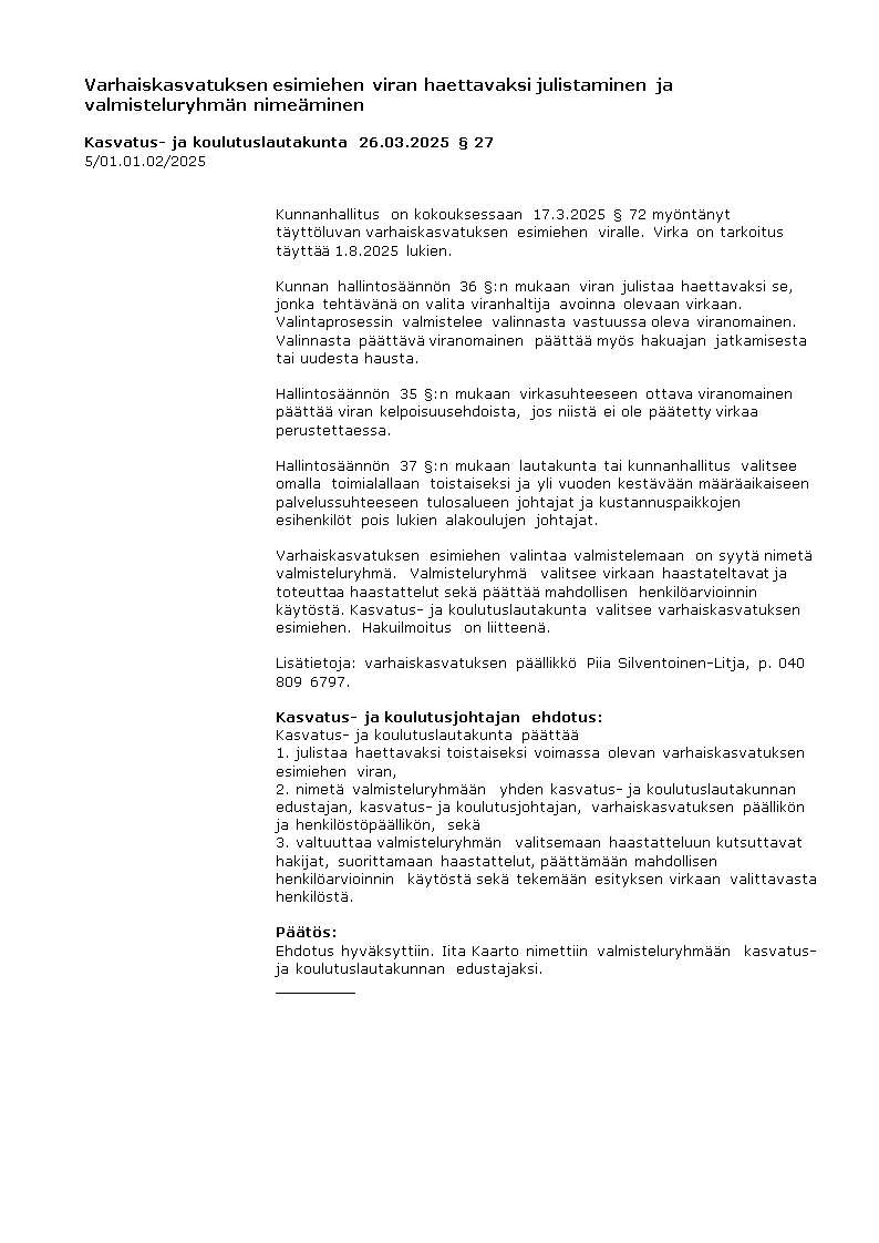 Liite 3 Hakuilmoitus, varhaiskasvatuksen esimies