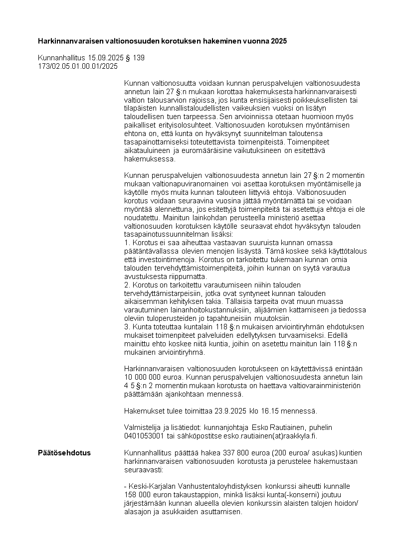 Pöytäkirja 15.09.2025/Pykälä 139