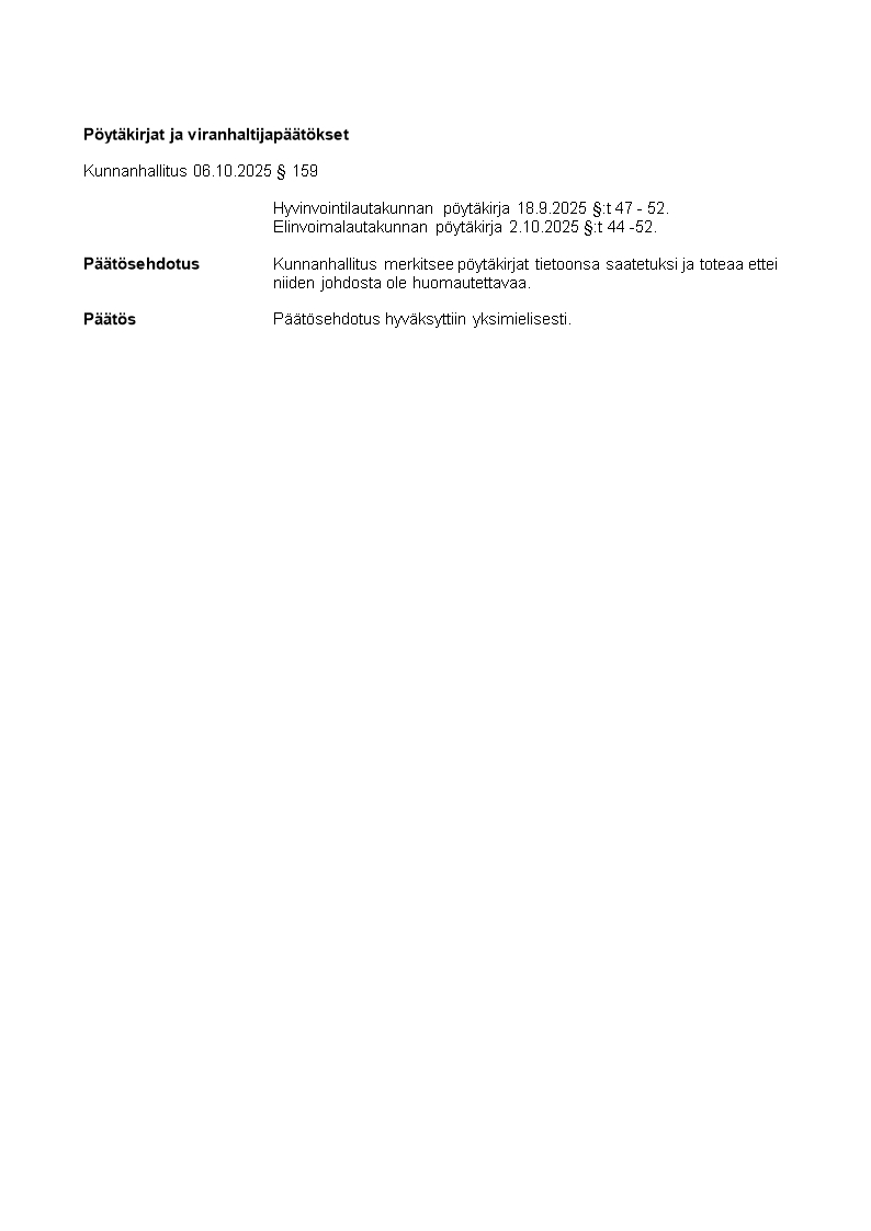 Pöytäkirja 06.10.2025/Pykälä 159