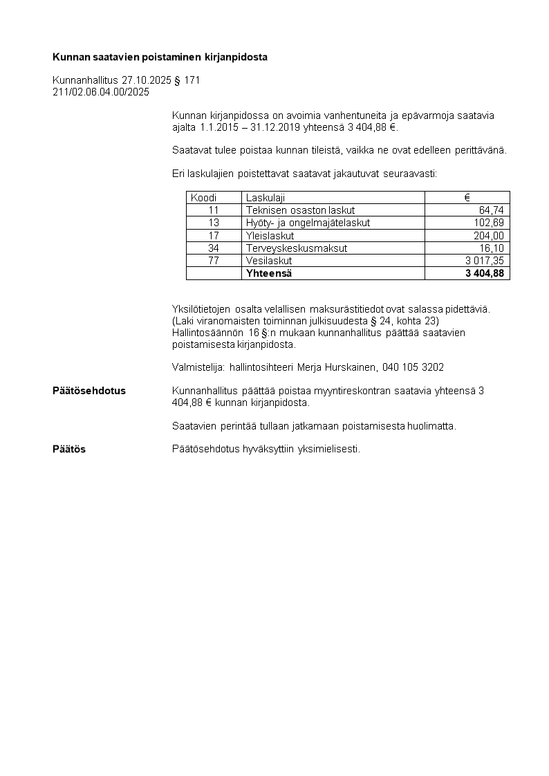 Pöytäkirja 27.10.2025/Pykälä 171