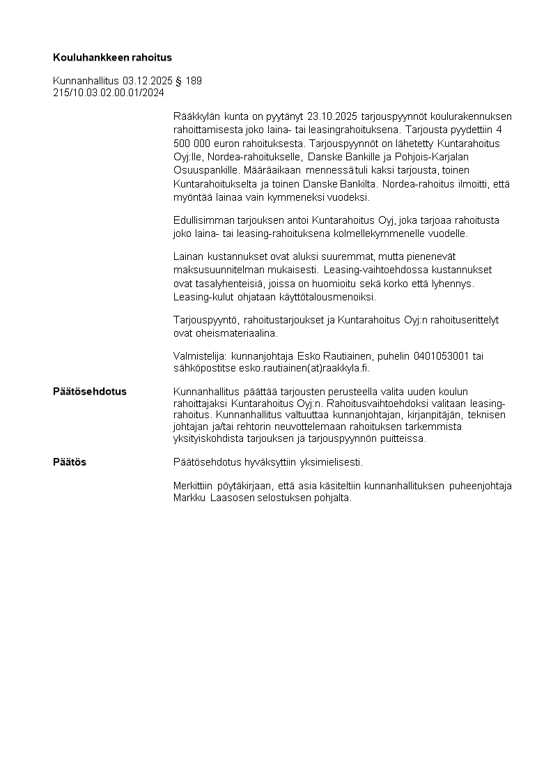 Pöytäkirja 03.12.2025/Pykälä 189
