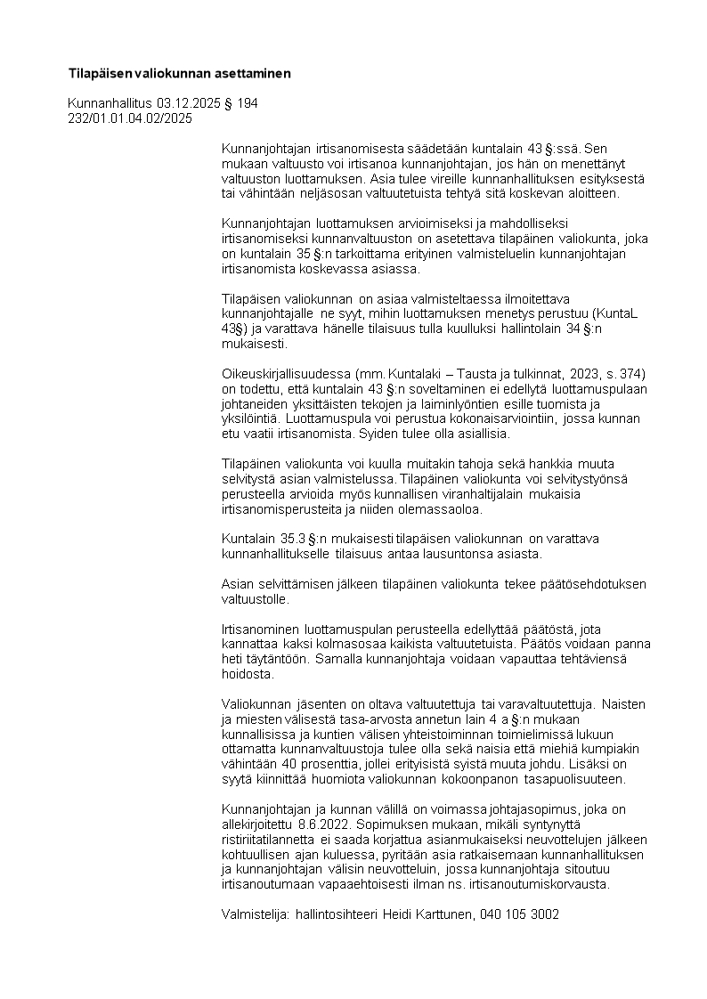 Pöytäkirja 03.12.2025/Pykälä 194