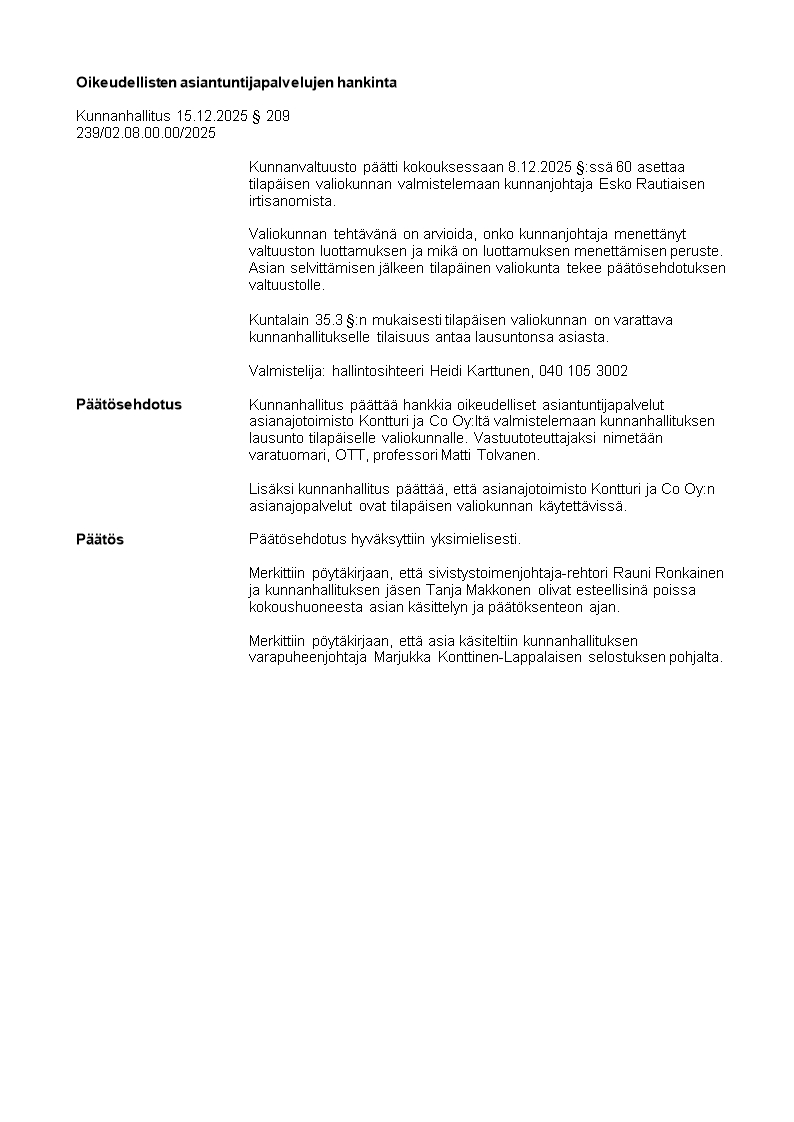 Pöytäkirja 15.12.2025/Pykälä 209