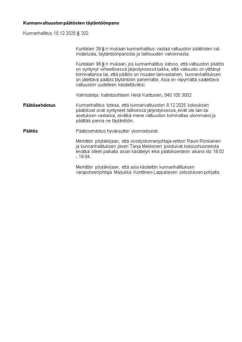 Pöytäkirja 15.12.2025/Pykälä 202